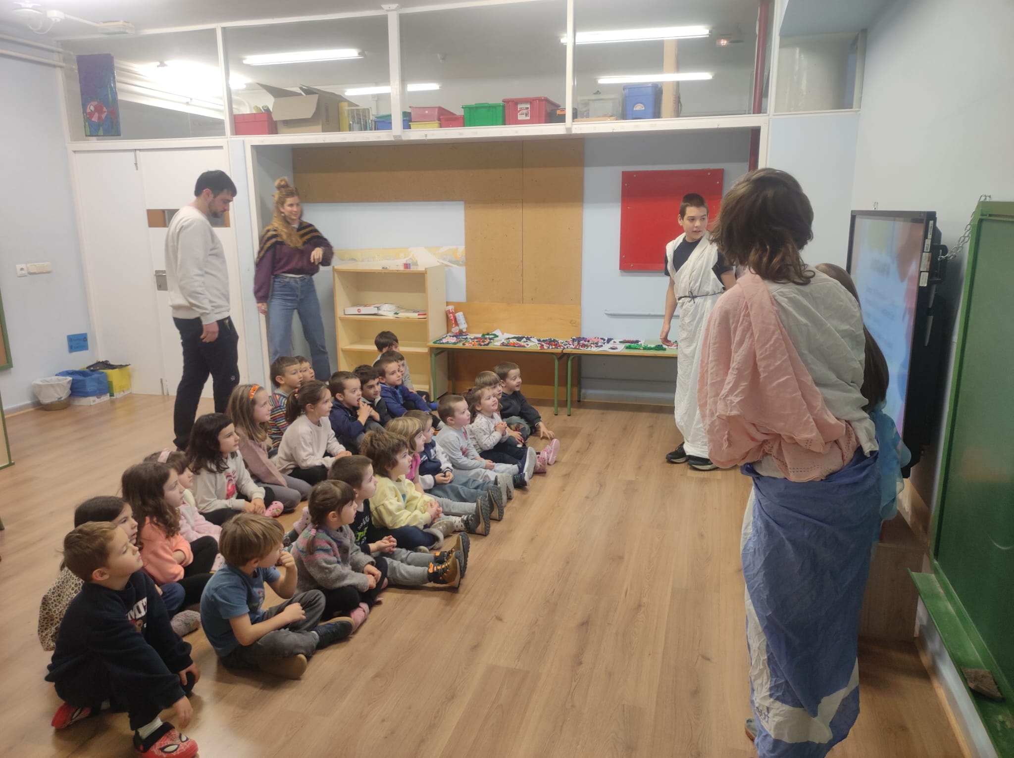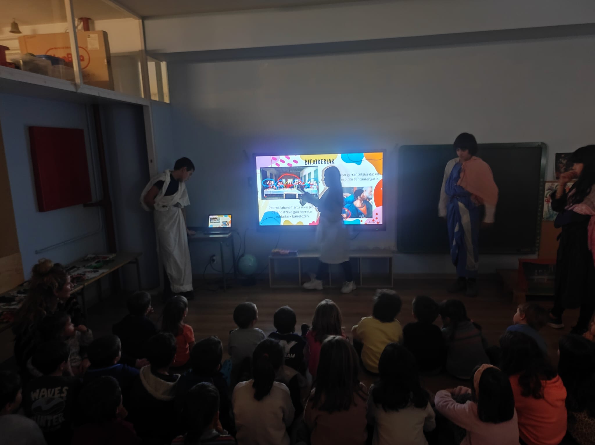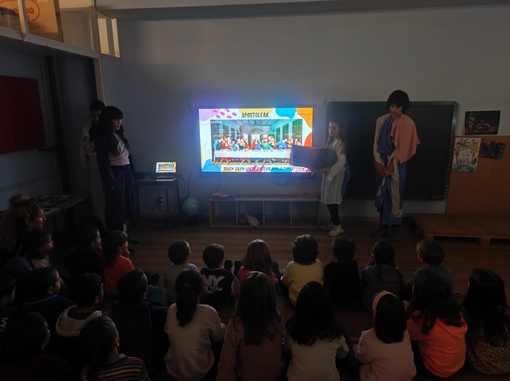 Leonardo Da VInciren azken afariaren inguruko tertulia artistikoa egin dugu lehen hiruhilekoan. Lehenengo gelan landu dugu eta ondoren DBHko ikasleek aurkezpenak eta jolasak prestatu dizkigute. Ederki pasa dugu eta historiaren zati bat ezagutzeko balio izan digu…